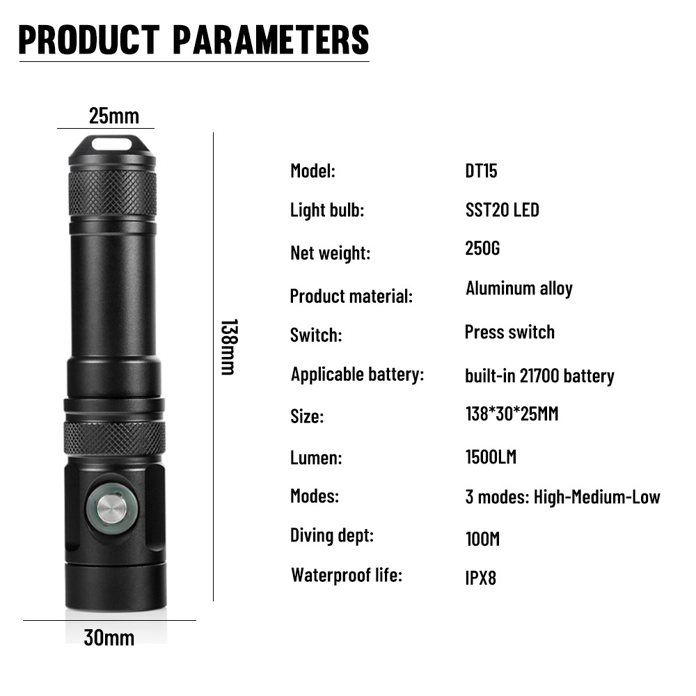 Powered by a high-capacity 21700 rechargeable lithium-ion battery, the DT15 offers extended runtime, making it ideal for long dives. Its efficient energy consumption ensures consistent performance throughout your underwater exploration, while the quick charging capability minimizes downtime.