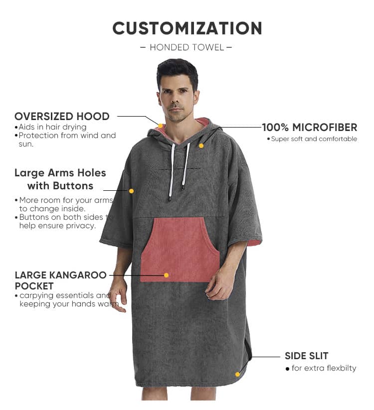 PONCHO SURF CHANGING Made of microfiber polyester, it’s perfect for changing out of swimwear, wetsuits, and swimsuits. It also doubles as a completely absorbent towel poncho that keeps you warm and dry after swimming or surfing. ROOM FOR PERSONAL CHANGES Perfect for wearing in public as a discrete, modest changing robe that keeps you warm from the cold, wind, or moisture. Ideal for swimming, surfing, lakes, rivers, camping, water activities, and changing clothes outside HOODIE AND POCKETS ON A TOWEL PONCHO Comfortable huge hood for protection from the sun, rain, and wind; a hoodie poncho that keeps your hands free to change clothes without dropping them; a spacious kangaroo pocket for your wallet, keys, and cell phone; and a beach changing towel. FOLDABLE AND Convenent broad arm openings and a bottom aperture for
