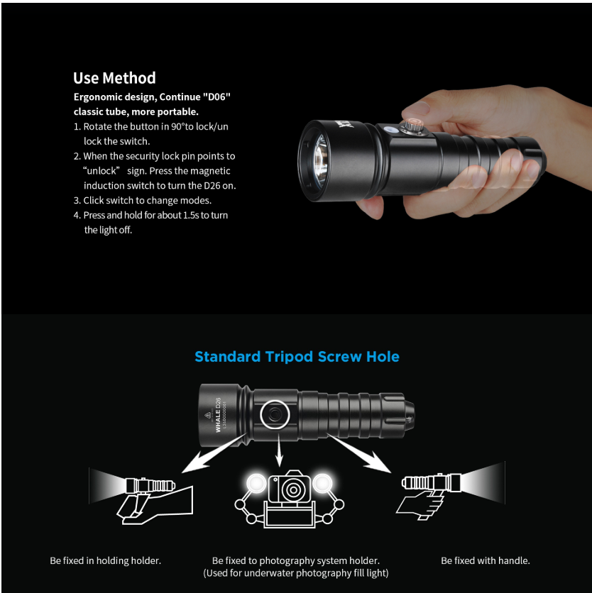 • 1100 lm is the maximum output. Two hours of running time. Streamlined Reflector Warm light, a revolutionary side switch, an anti-reflective coating on the ultra-clear tempered glass lens, an ergonomic design, and a more portable version of the “D06” classic tube.XTAR Whale D26 1100 Lumen Dive Light